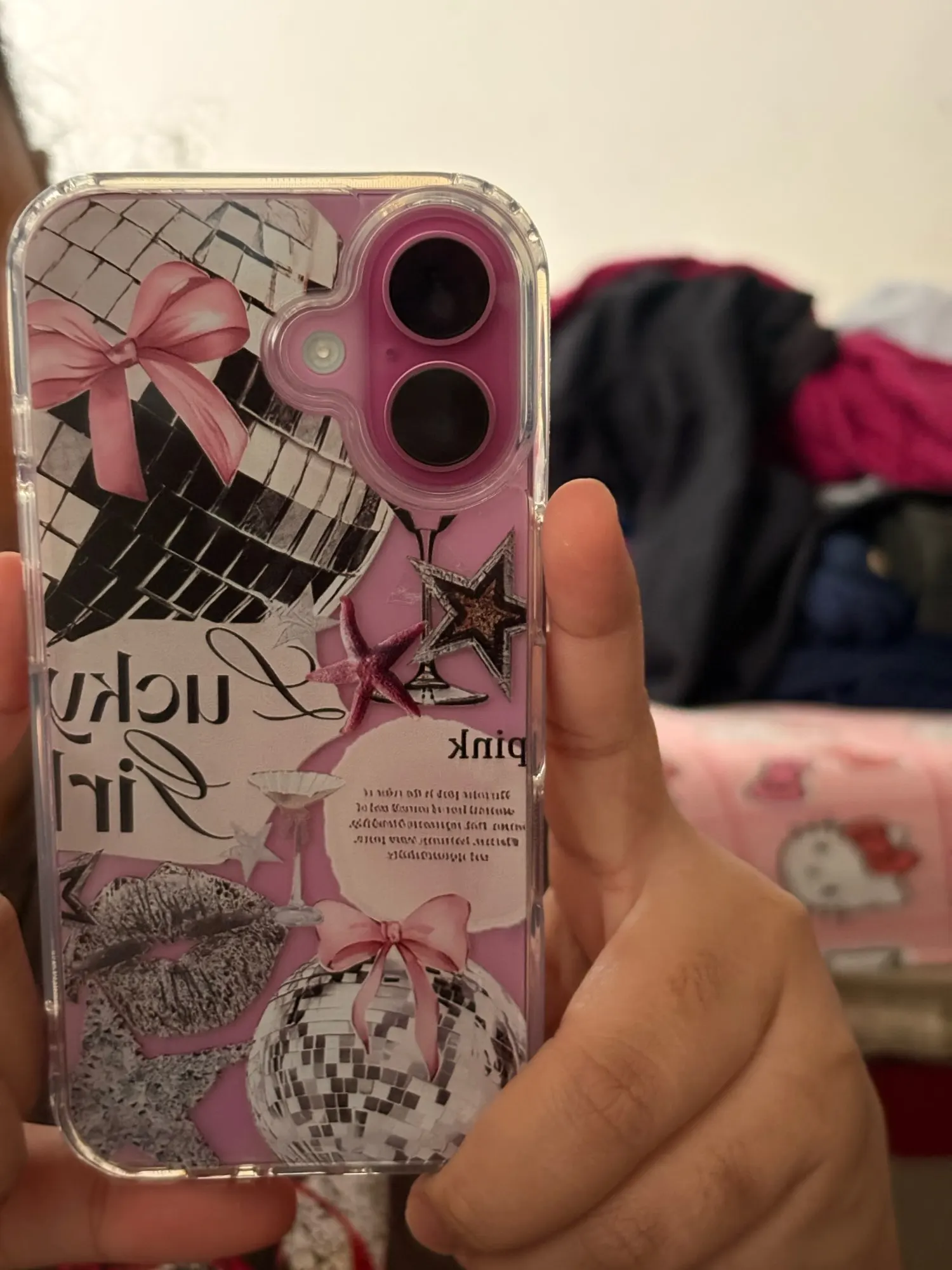 The design with a pink bow and disco ball details adds an aesthetic and feminine touch, ideal for those who want to combine fashion and functionality .