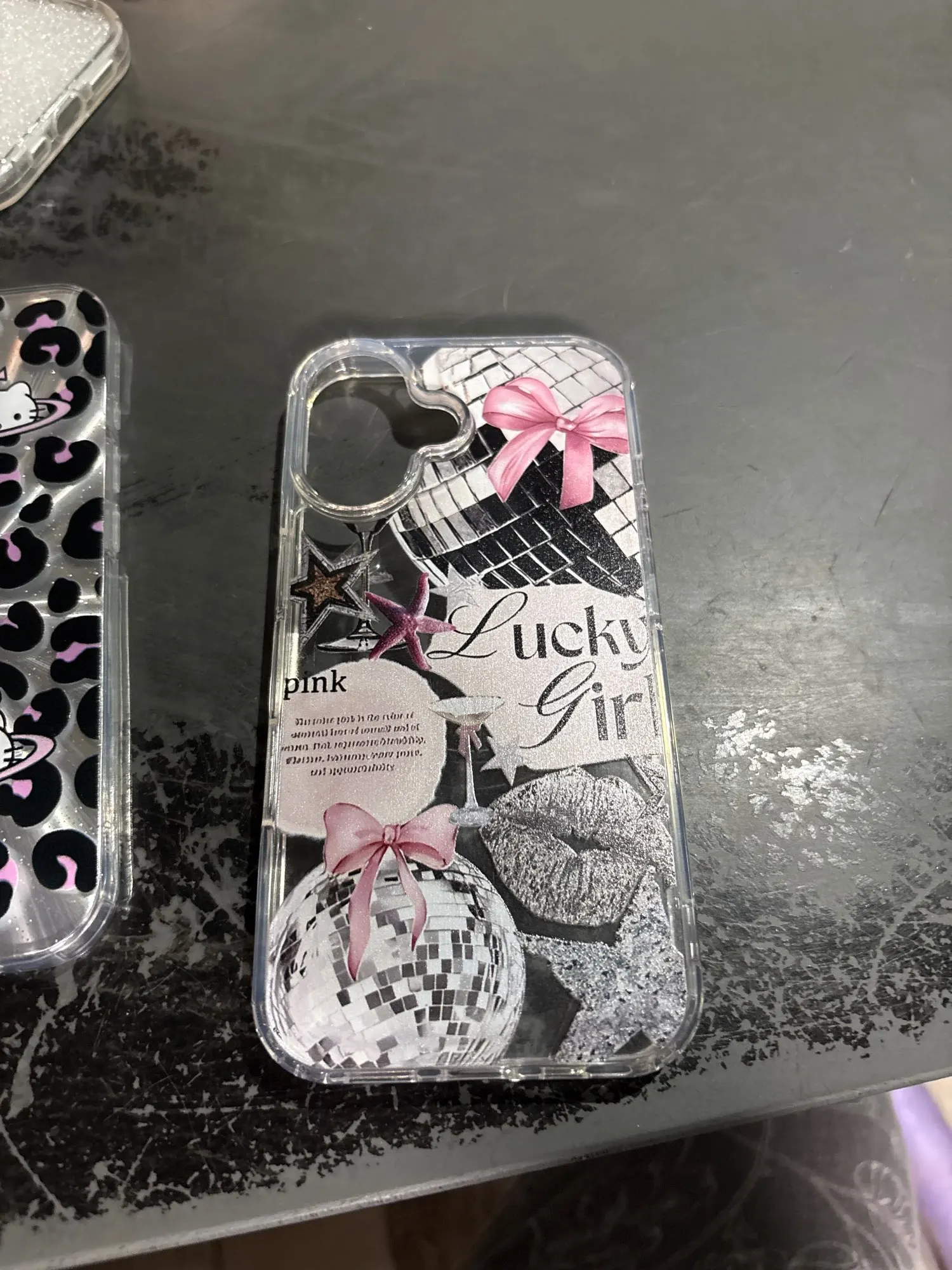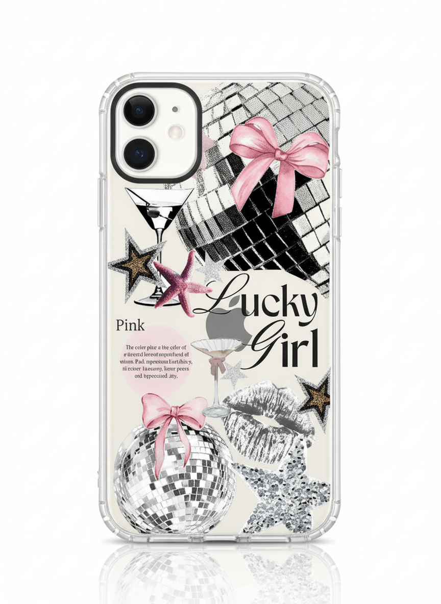 "Lucky Girl" design with pink bow and disco ball.